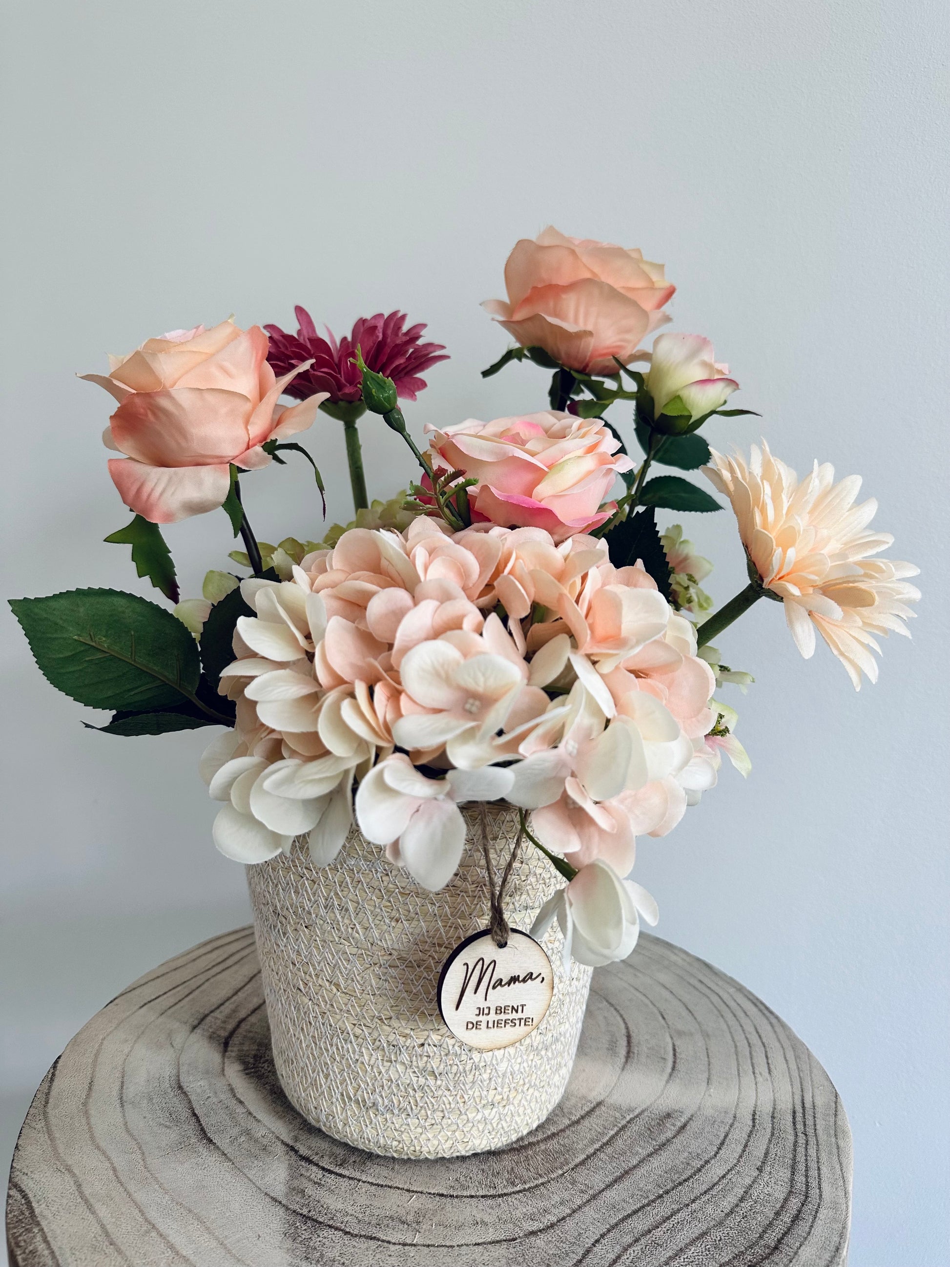 Het bloemstuk kan ook zonder houten label “mama jij bent de liefste” geleverd worden. Geef dit even mee in het veld opmerkingen bij het afrekenen