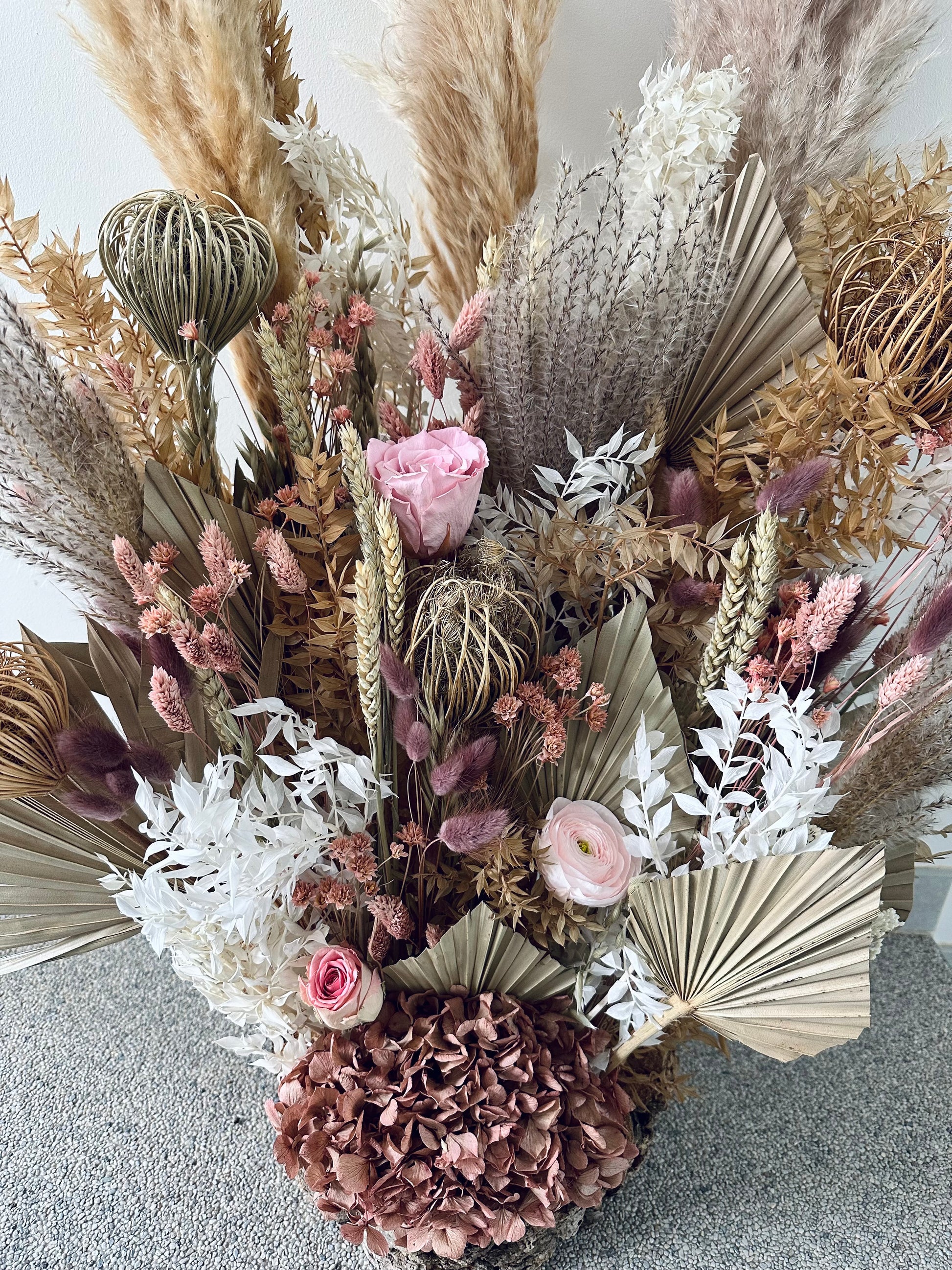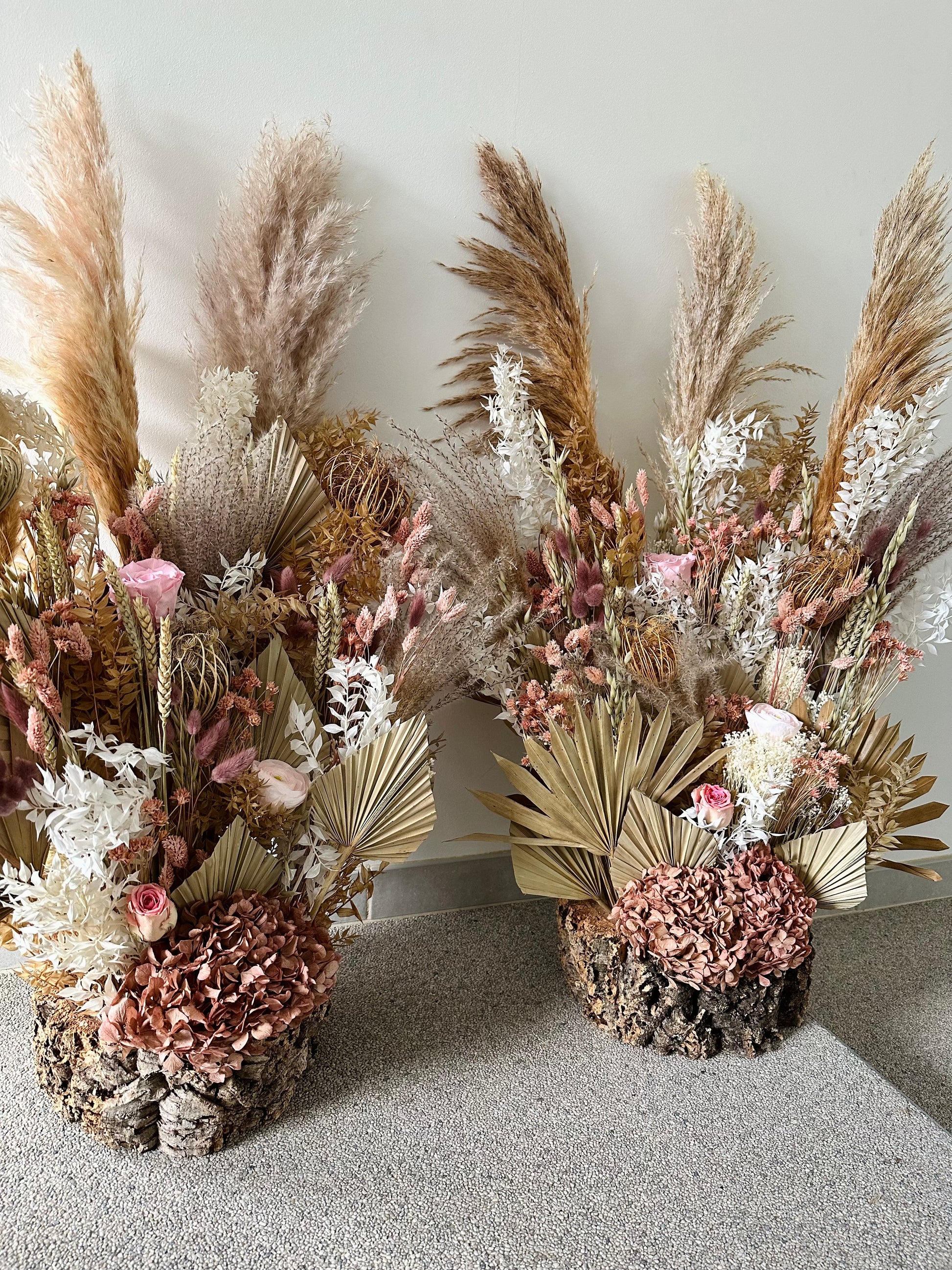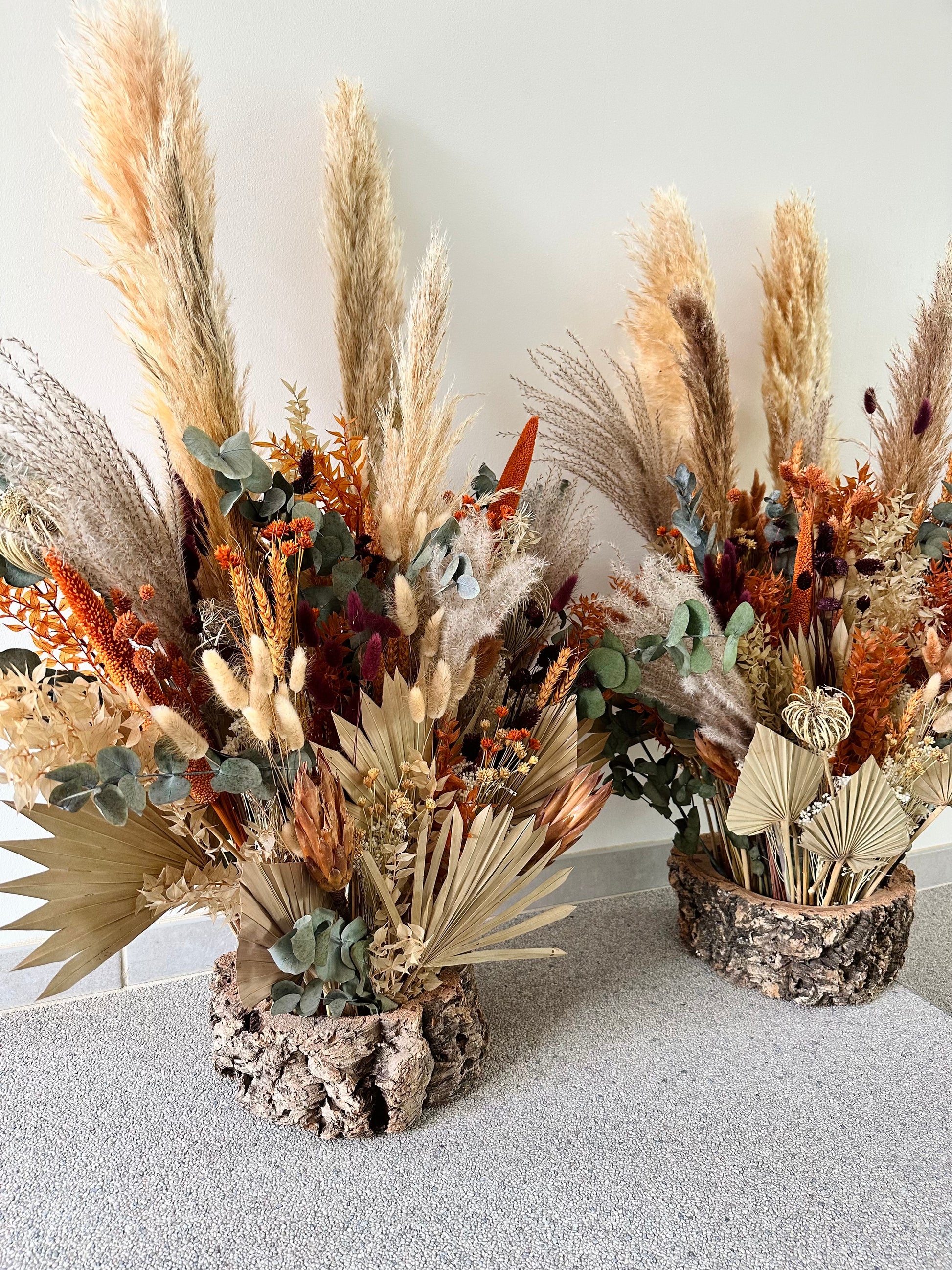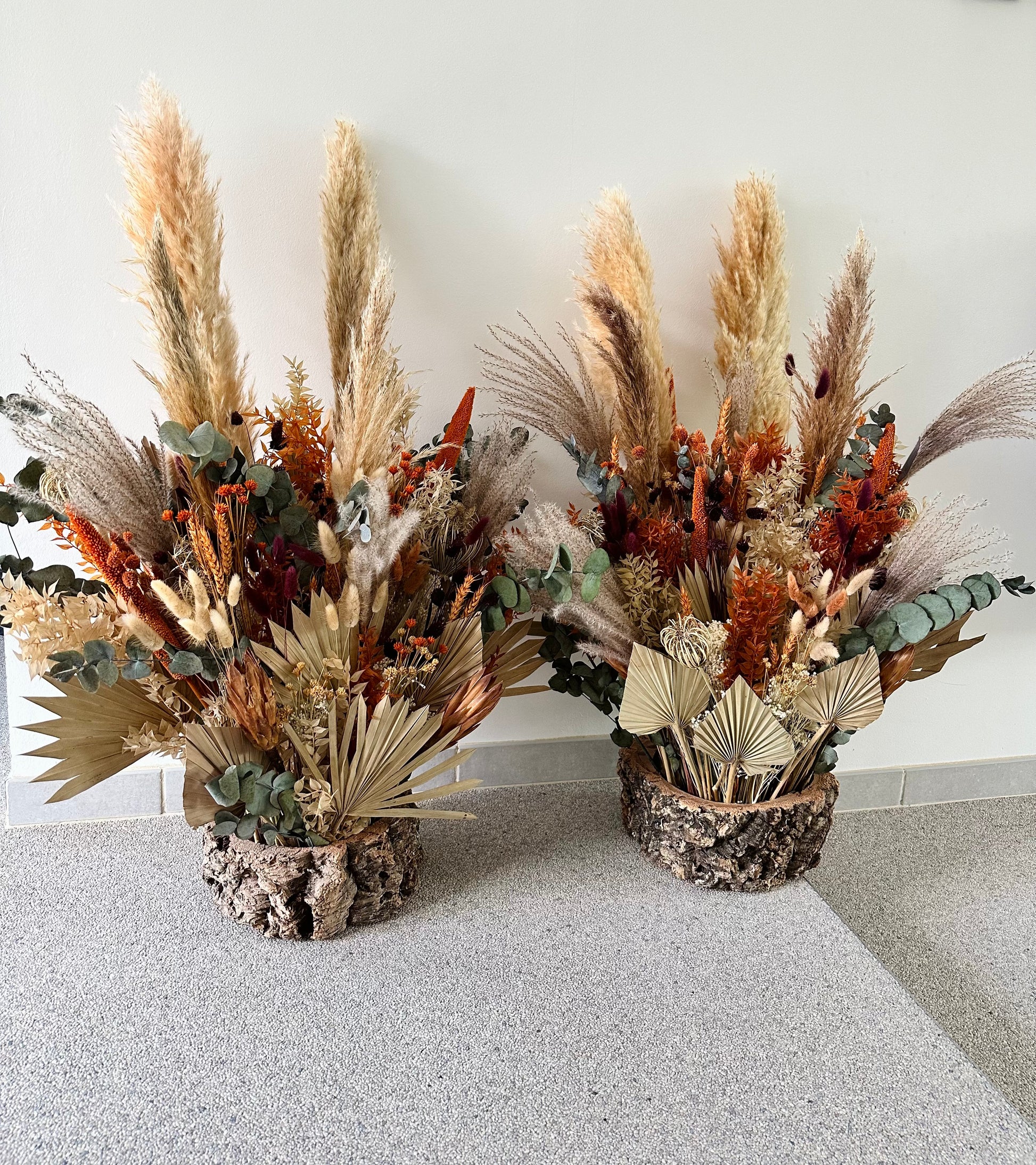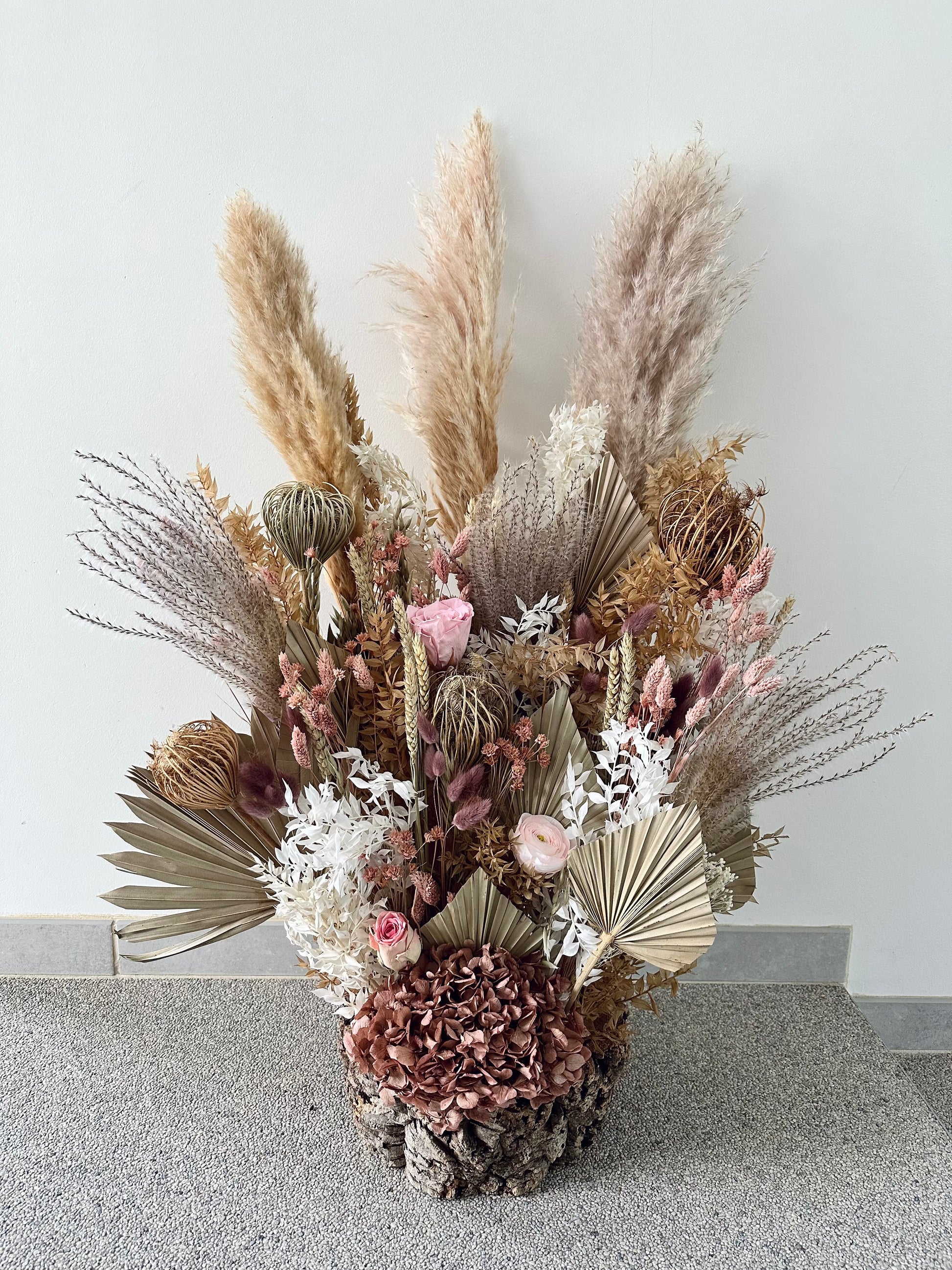 Het bloemstuk komt in een kurke pot (boomstronk motief) en het wordt volledig naar kleurenwens gepersonaliseerd.