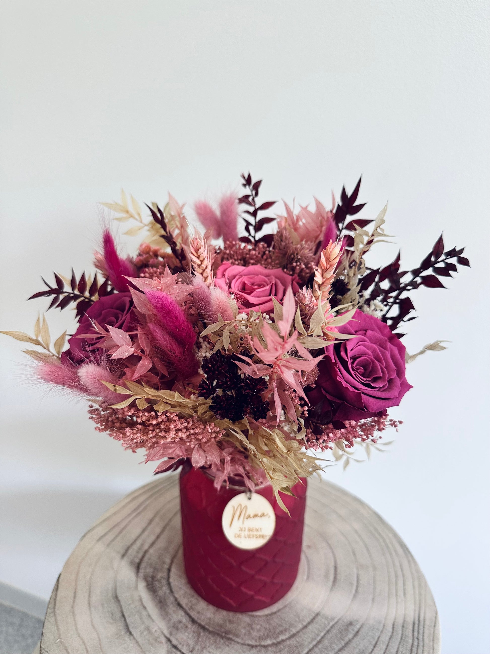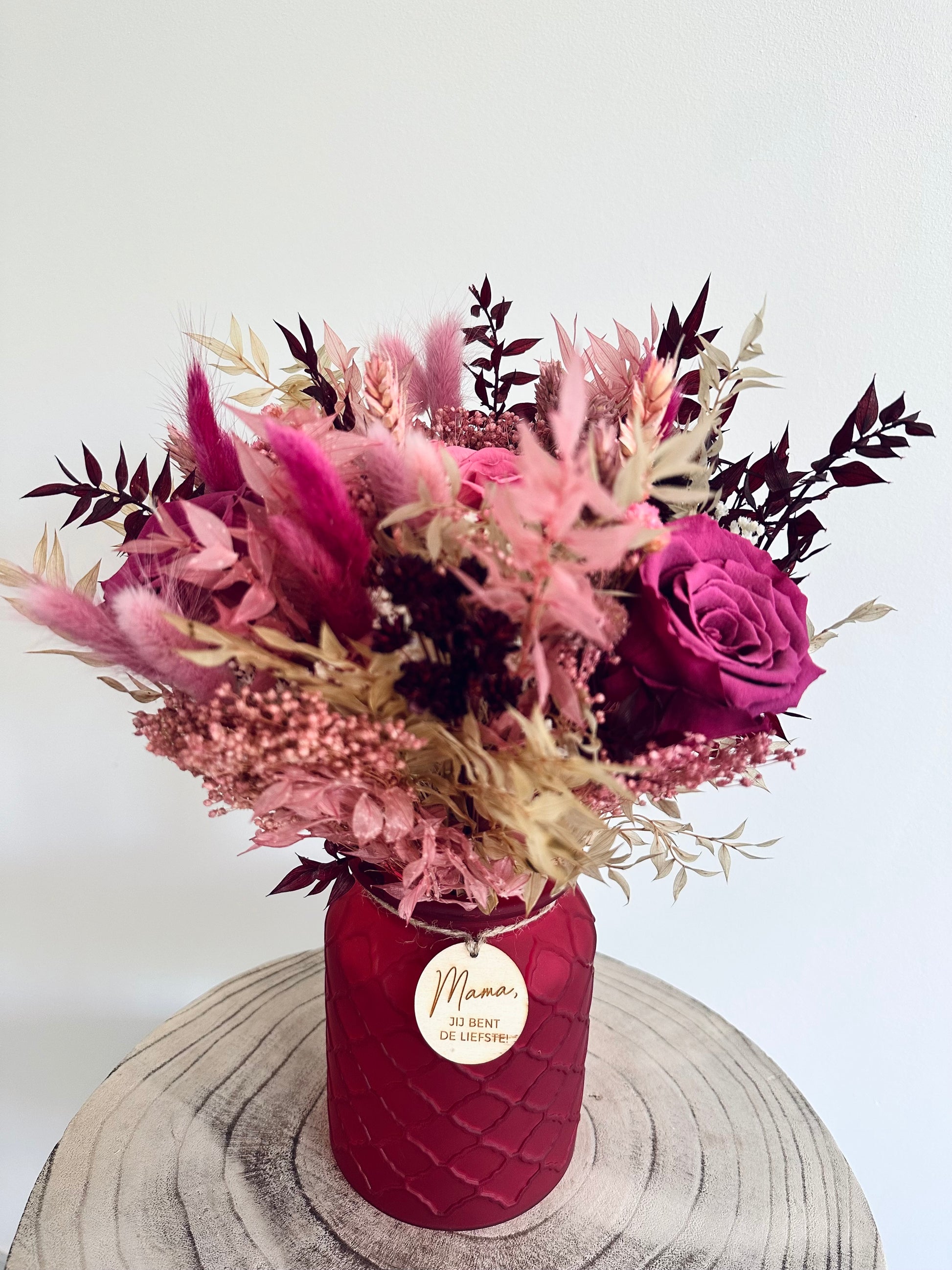 het boeket is inclusief vaas en houten label “mama jij bent de liefste”