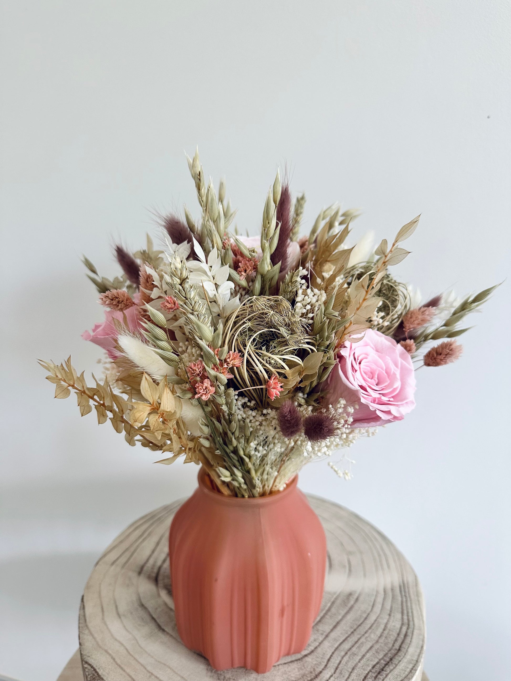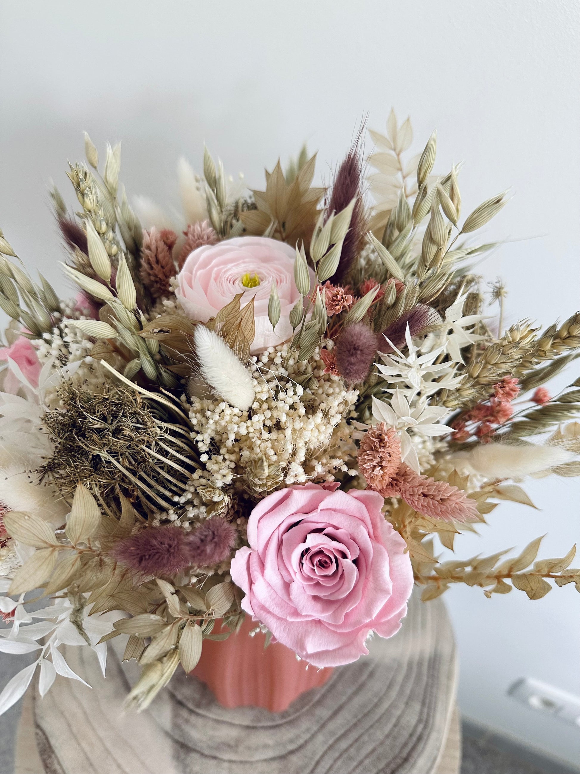 Dit boeket met droogbloemen is gecombineerd met preserved rozen. Dit zijn rozen die heel lang mooi blijven.