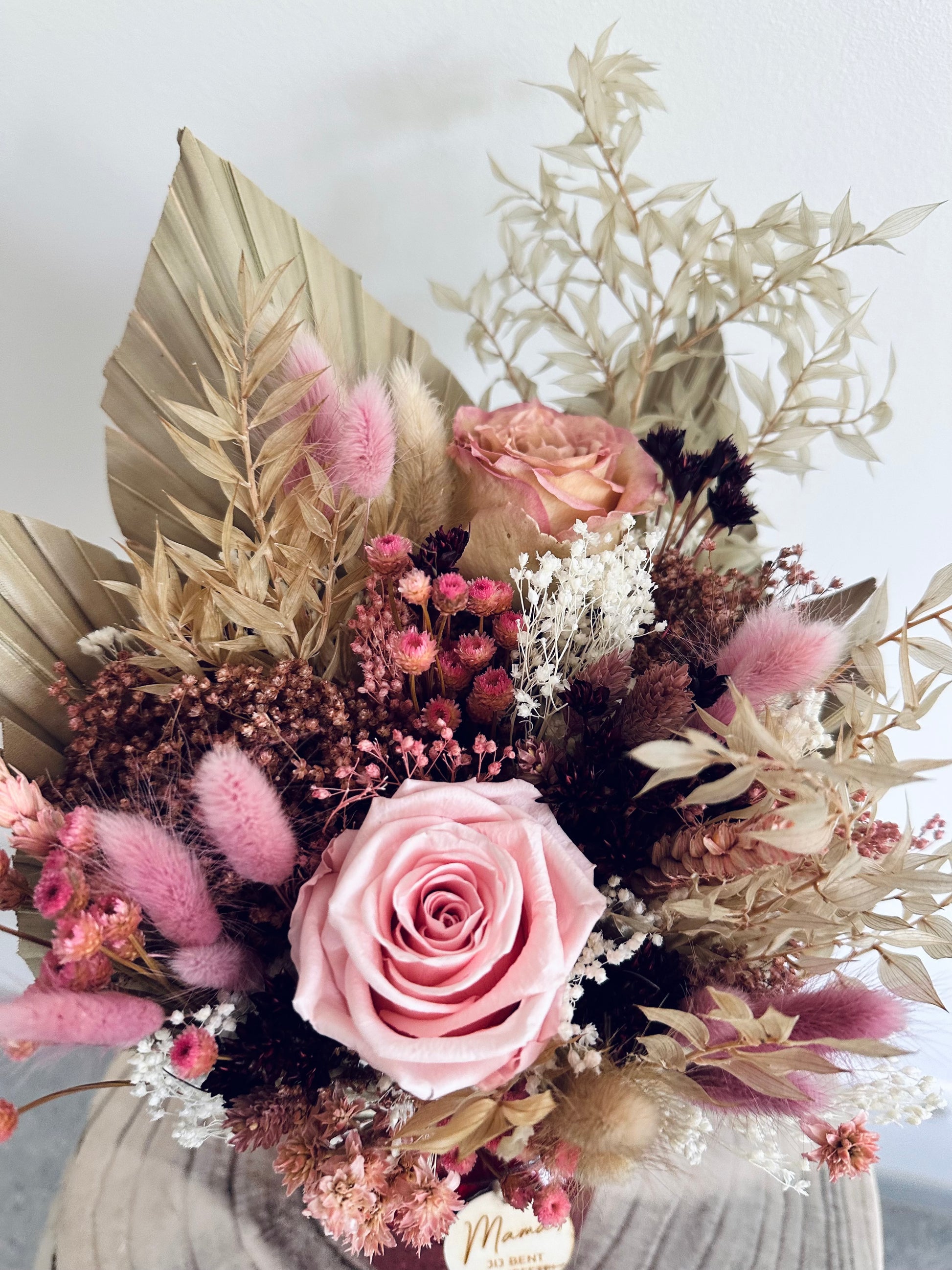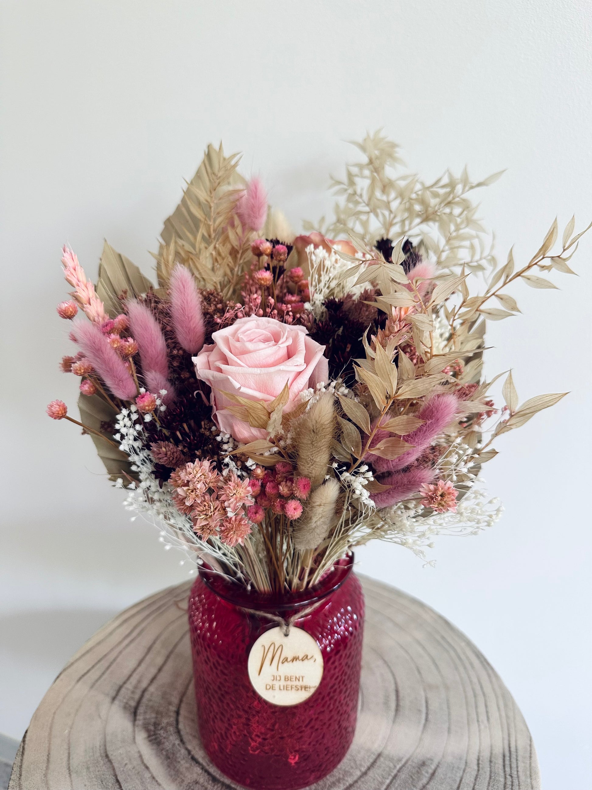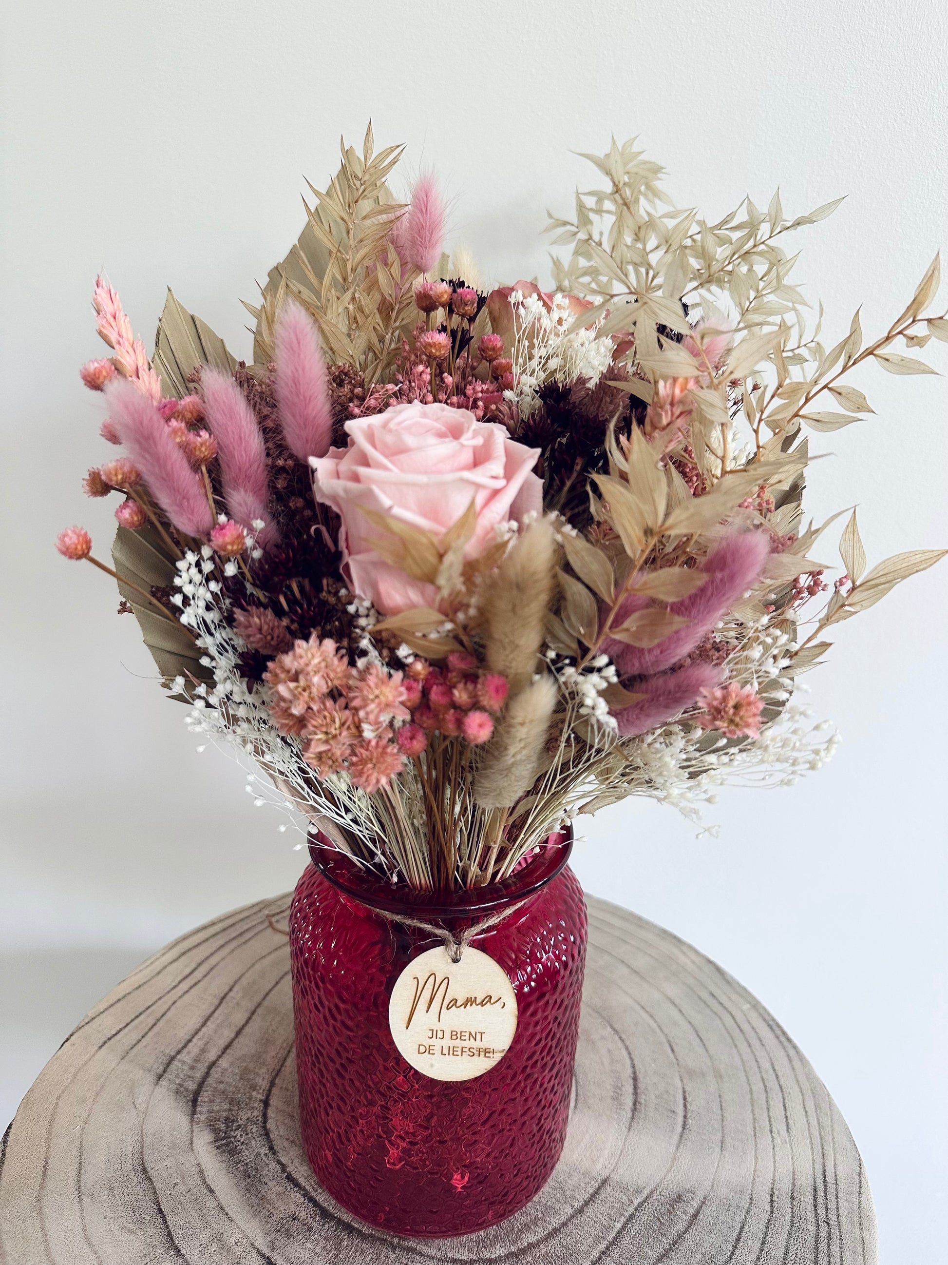 het boeket is inclusief vaas en houten label “mama jij bent de liefste”