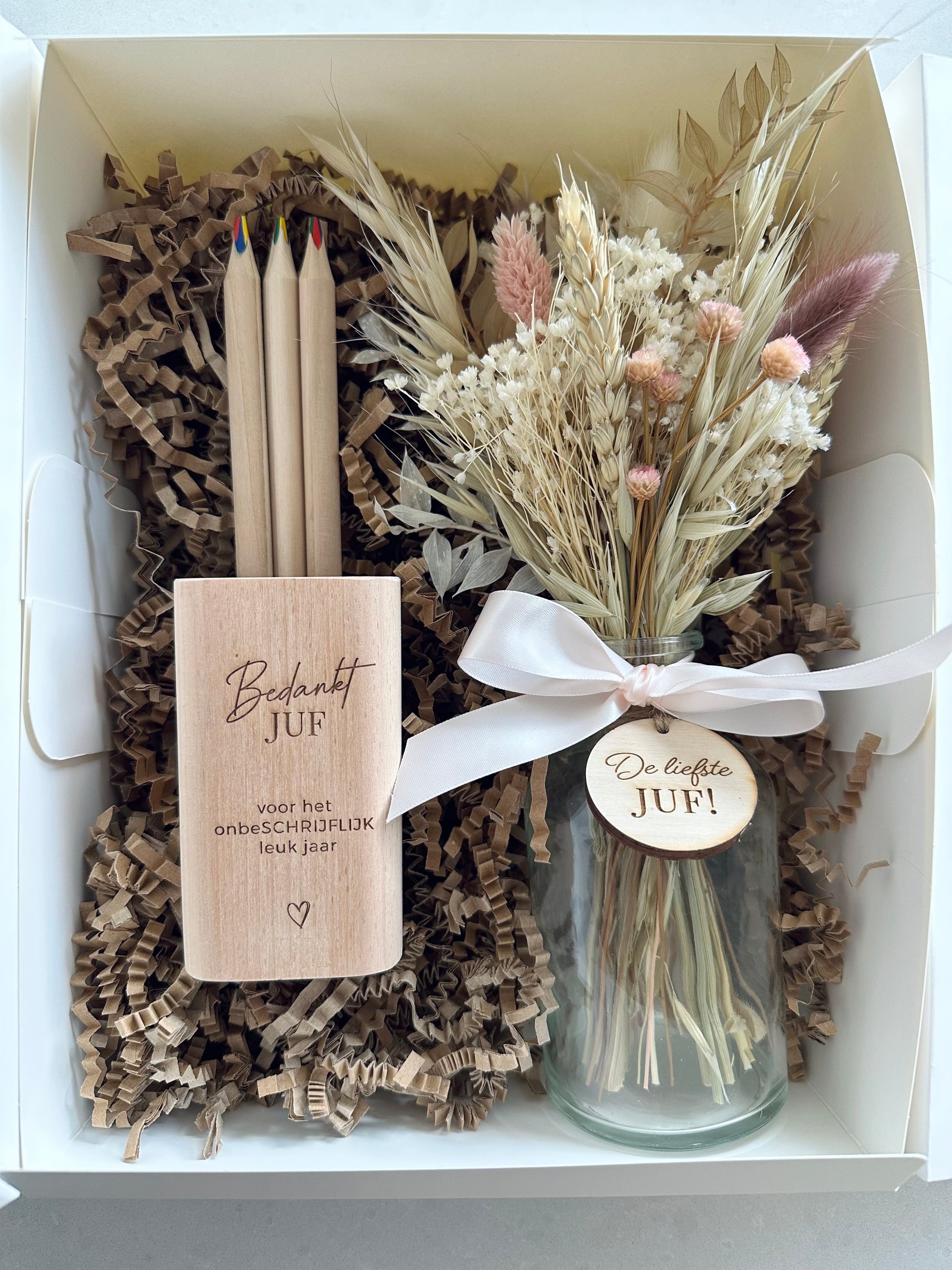 Deze leuke geschenkset voor juf bevat een vaasje met droogbloemen en houten labeltje en de pennenhouder met leuk opschrift en 3 potloden.