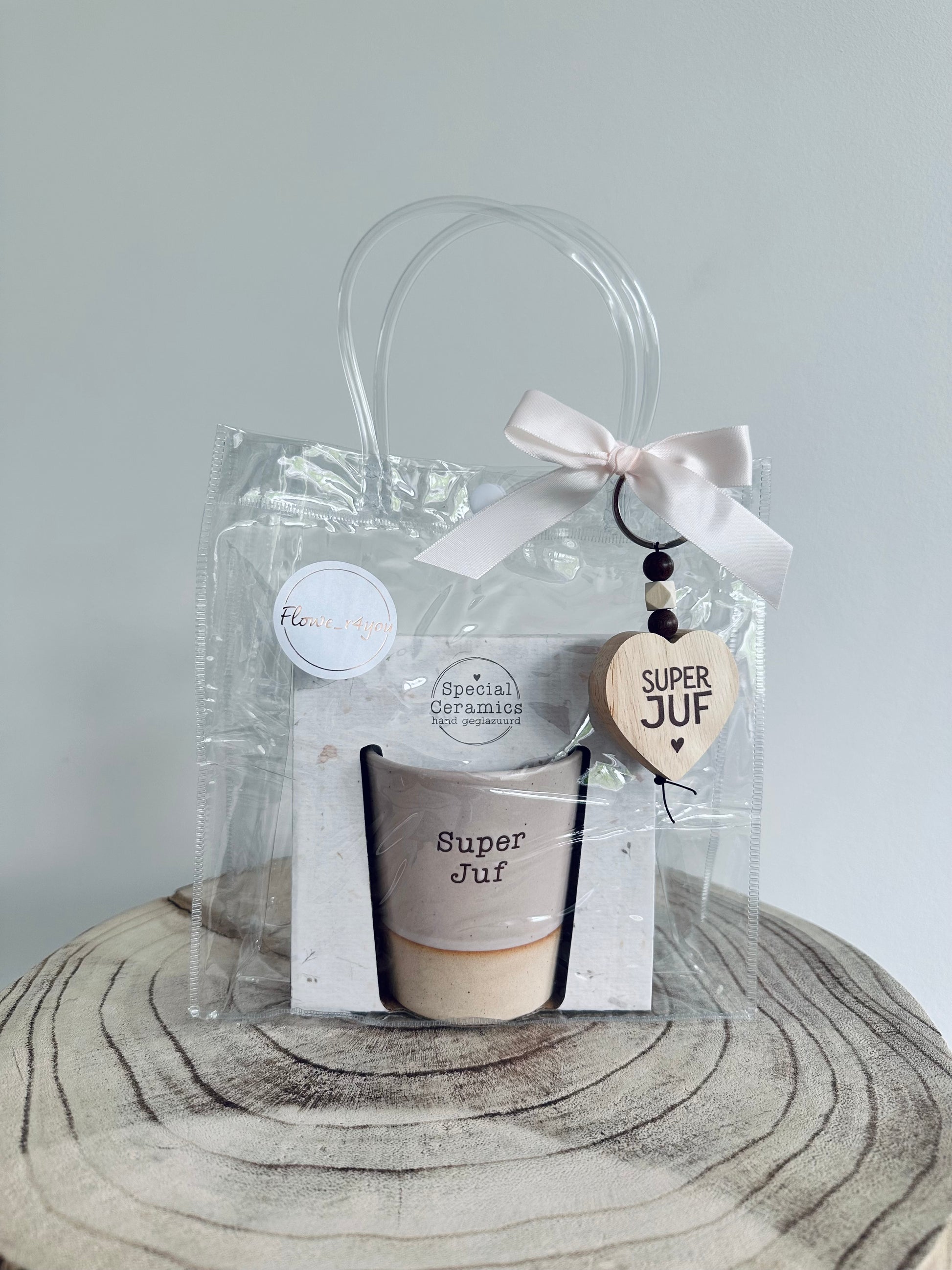 Deze Geschenktas gevuld met een ceramics mok en een houten sleutelhanger is een leuk cadeautje om de juf te bedanken voor het afgelopen schooljaar.