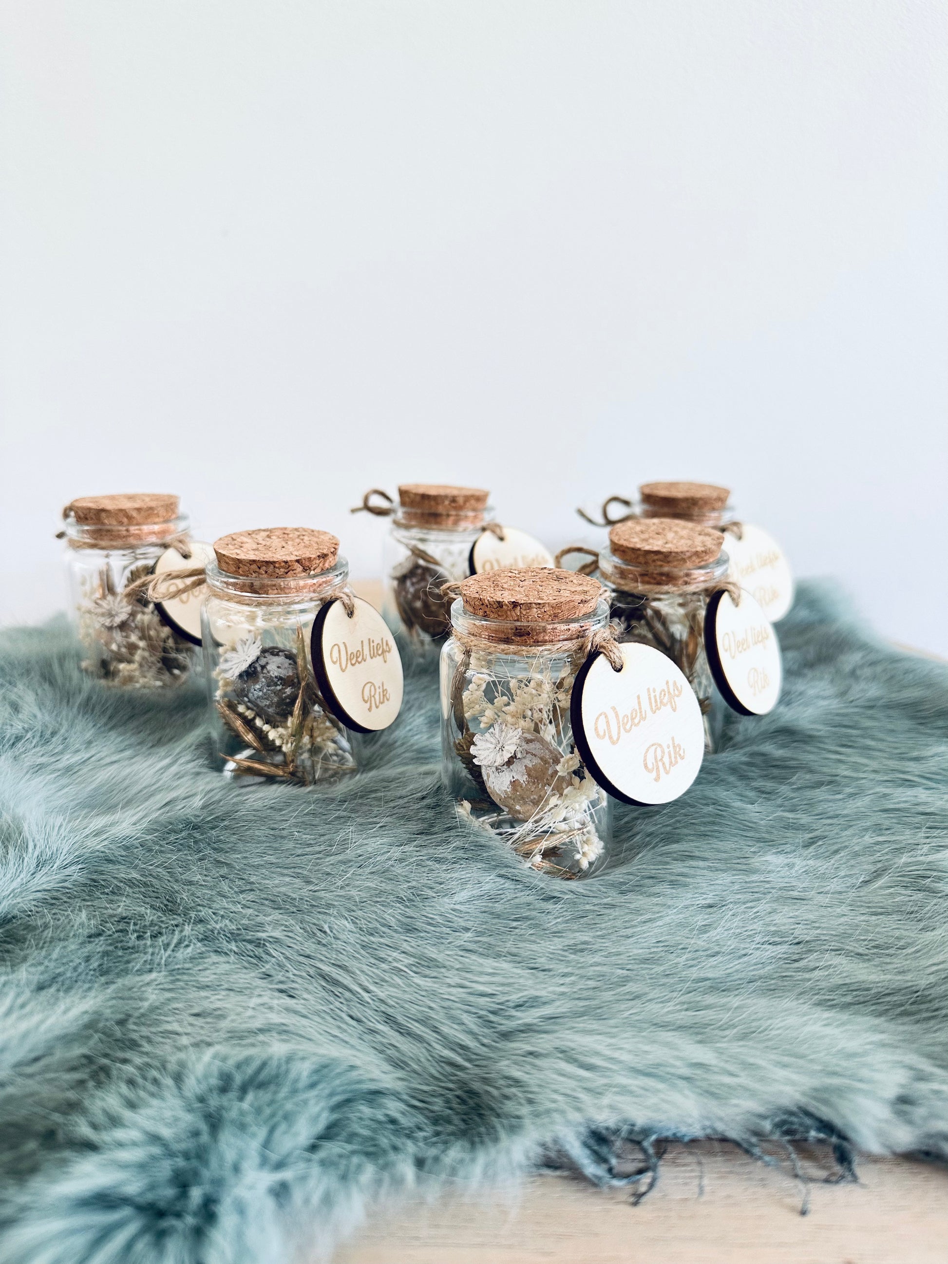 wil je er graag een houten gepersonaliseerde tag aan? Dat kan! Hiervoor betaal je 1€ extra per stuk.