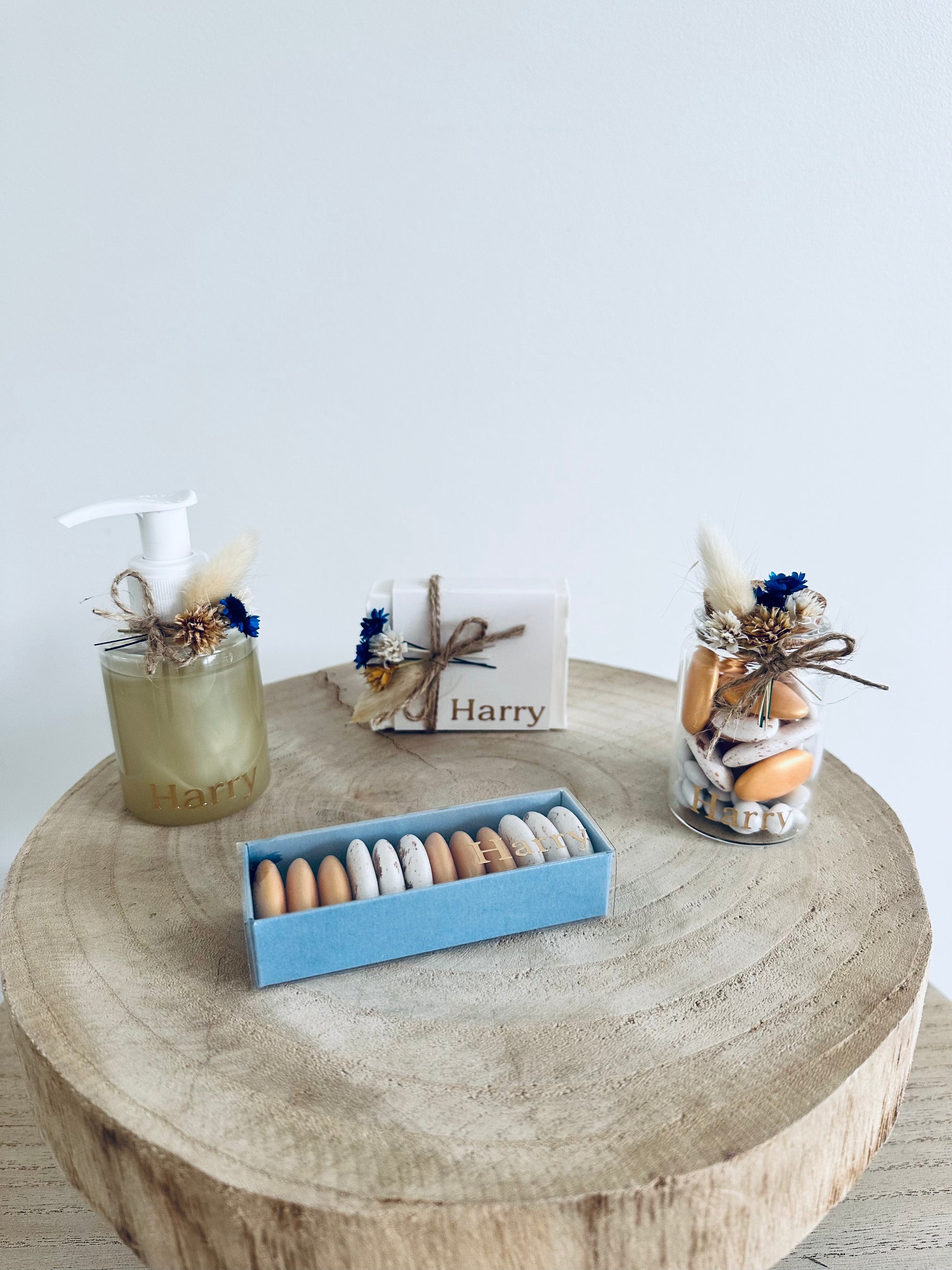Je kan ervoor kiezen om je doopsuiker af te werken met droogbloemen en een naamsticker.