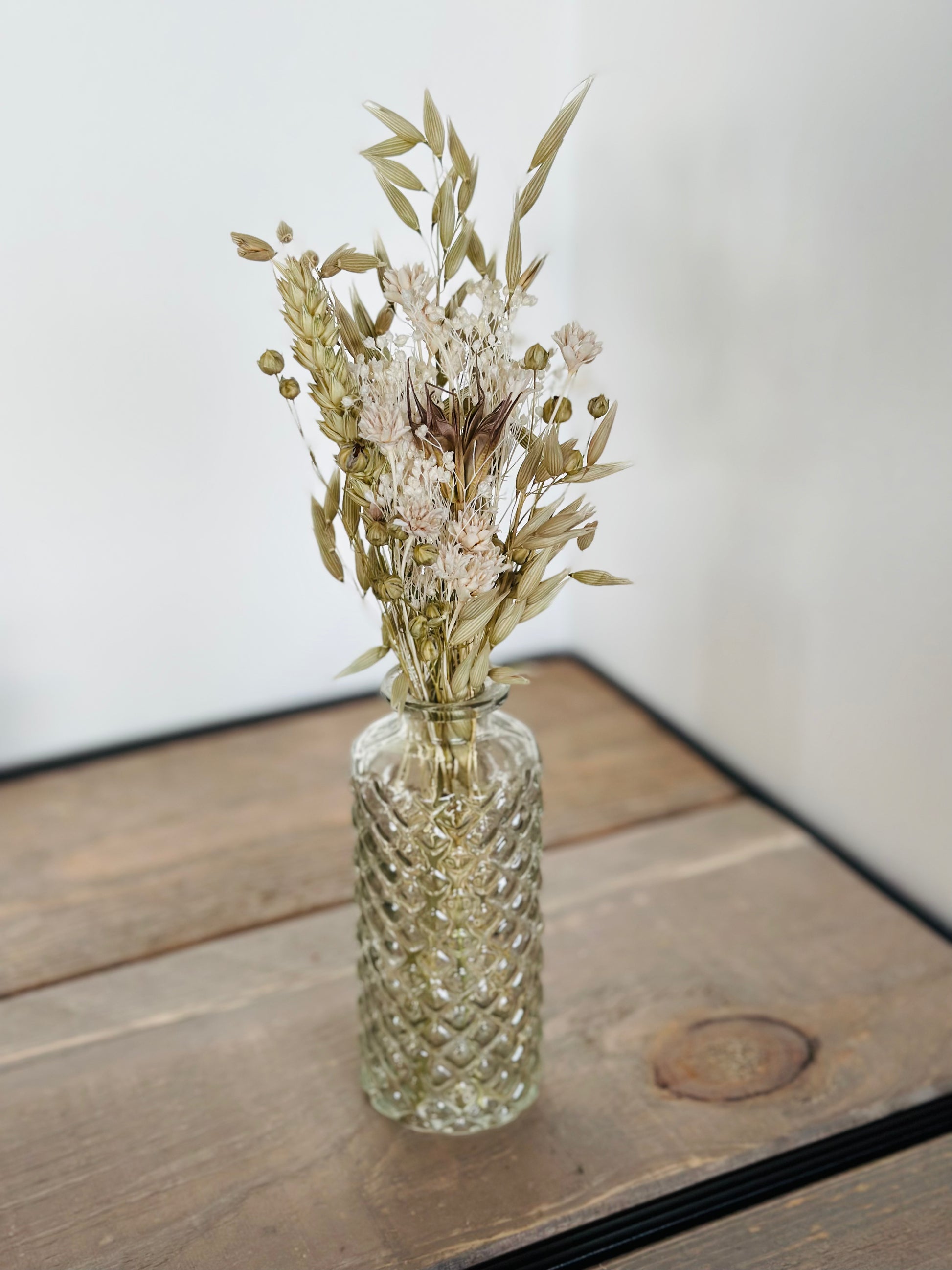 De vaasjes met droogbloemen zijn ideaal als bedankjes op een communie of trouwfeest of bij een geboorte.